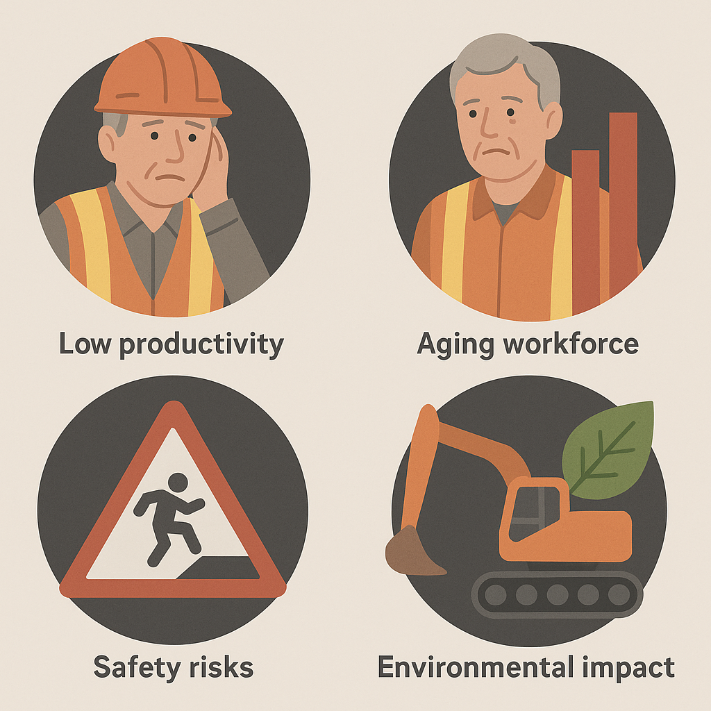현재 건설산업은 여전히 현장 중심·노동집약형 구조에 머물러 있으며, 이로 인해 생산성 정체·숙련인력 부족·안전사고 다발·환경부하 증가 등 복합적인 한계에 직면해 있습니다. 건설근로자의 평균 연령은 50대를 넘어섰고, 청년층 비중은 7.9%에 불과하며, 산업 사망자 비중은 전체의 24.1%로 가장 높은 수준입니다. 또한, 분절된 공급망과 현장 맞춤 시공, 날씨·입지 제약 등으로 인해 제조업 대비 디지털화와 자동화 수준이 현저히 낮은 산업으로 지적되고 있습니다.