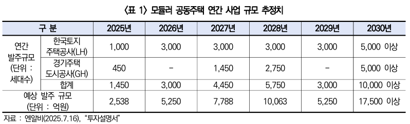 한국건설산업연구원에서 당사의 공시자료(25.07 투자설명서)를 발췌하여 국내 모듈러 건축 시장 전망을 하였습니다. 2003년 8억 원에서 2023년 8,055억 원으로 20년간 1,000배 이상 성장했으며, 2030년에는 최대 4조 4천억 원 규모에 이를 전망입니다. 특히 모듈러 공동주택 시장은 올해 2,538억 원에서 2030년 1조 7,500억 원으로 7배 확대될 것으로 전망됩니다. 정부는 ‘9·7 주택공급 확대 방안’의 핵심 과제로 모듈러 공급을 추진 중이며, LH·GH 등이 중장기 발주계획을 수립하고 있습니다. 다만 현재 공공 중심의 시장 구조를 민간으로 확산시키기 위한 제도적 기반과 인센티브가 필요하다는 지적이 제기됐습니다.